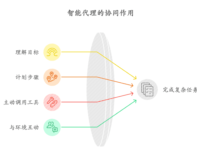 。你给个目标,它自己就能拆解任务、查信息(可能用 RAG 查公司差旅标准,用 Function Call 查航班酒店)、做决策、执行操作(用 Function Call 调用预订 API),最后给你结果。它是有自主“行动力”的。 -
