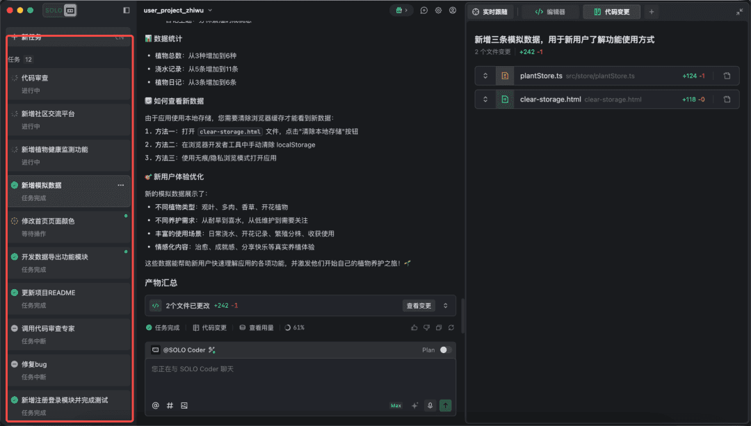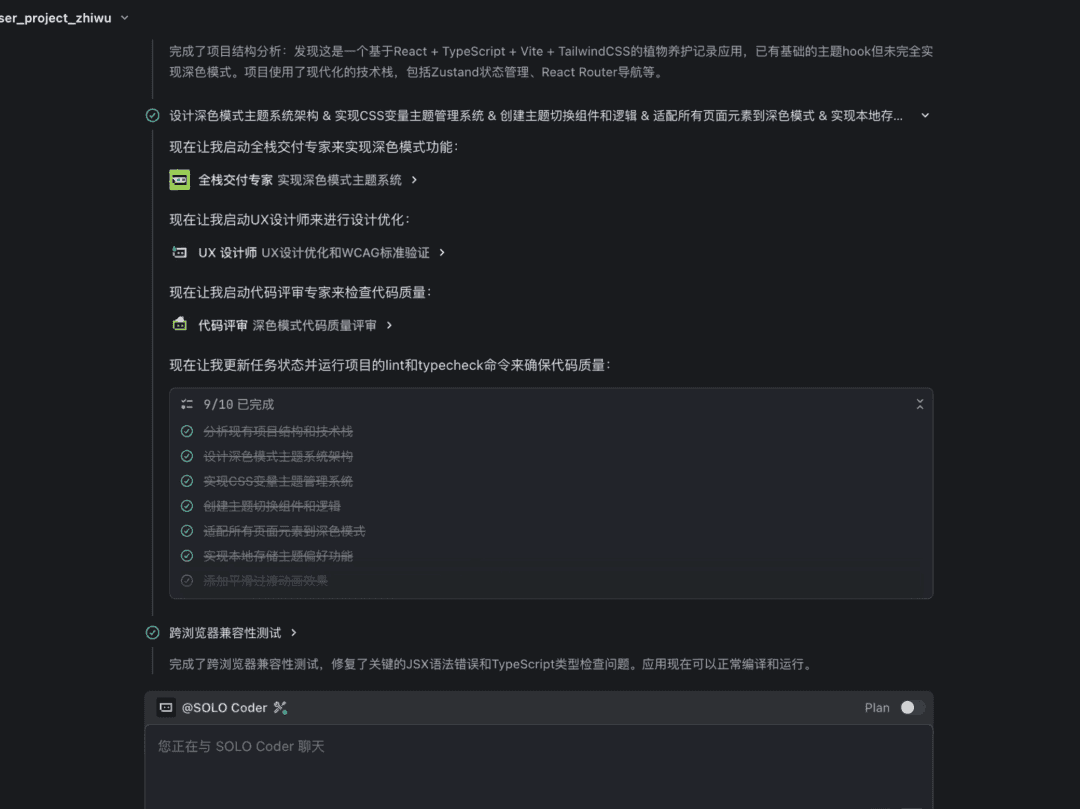 SOLO 模式支持在同一空间内并行处理多个开发任务,你可以一边让 AI 进行主要功能开发,一边在新任务里做技术问答或推进另一个模块。系统还会为对话自动生成智能标题,便于你快速识别与管理。