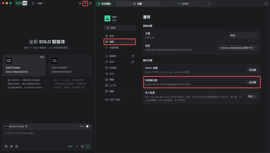 TRAE 内置一系列常用快捷键,你可以直接使用,或进行自定义配置,以下是部分 SOLO 模式下默认的快捷键。