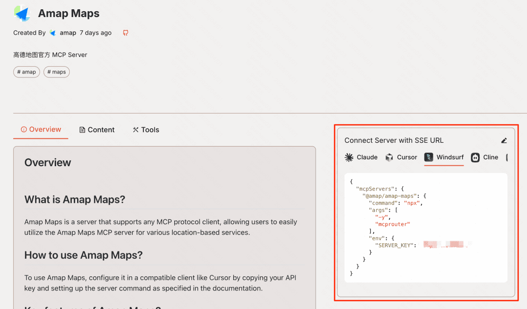 只需要将 json 代码发给 AI 模型(Claude 或者 Deepseek)然后让他将这个 Json 转换为正常的命令,同时将环境变量单列出来 就行,比如下面这个高德 MCP 的 Json 就成功的分离了,我们将命令和环境变量分别填写就行。
