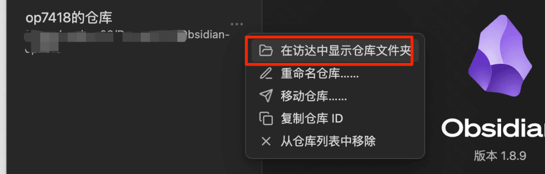 然后选择在「访达中显示仓库文件夹」,找到文件夹之后按住「Option」键右键选择复制这个文件夹的路径,记下来备用。