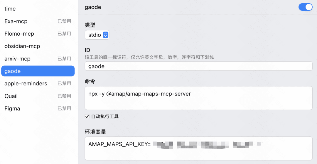 这个时候我们的 MCP 就配置好了,只需要点击右上角的开关就能启用,如果这个 MCP没有敏感风险的话,可以勾选自动执行工具,这样效率高点。