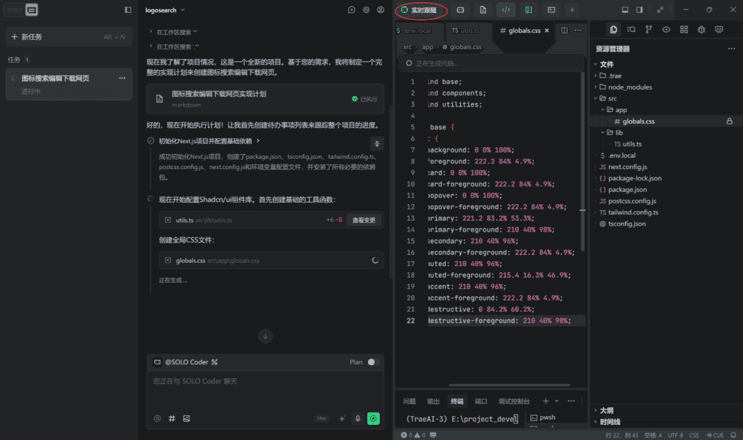 TRAE SOLO有一个特别酷的实时跟随的功能,开了以后SOLO会自动切换面板,把整个开发过程都暴露给你看,就跟你看一场实时AI编程直播其实没啥区别。